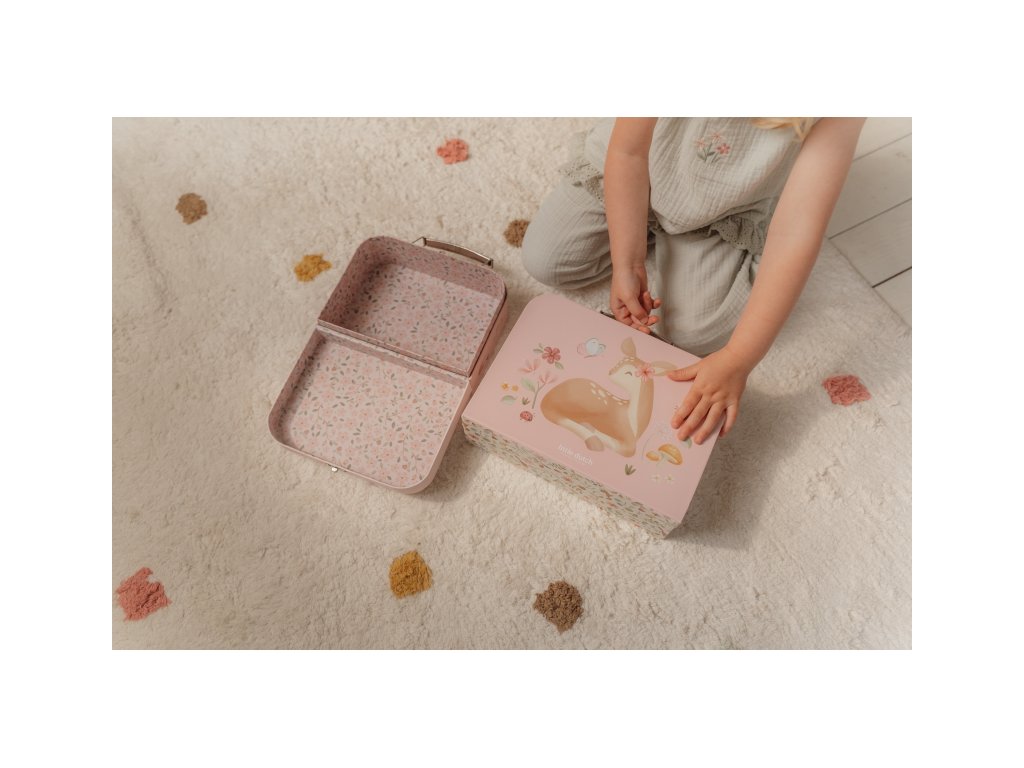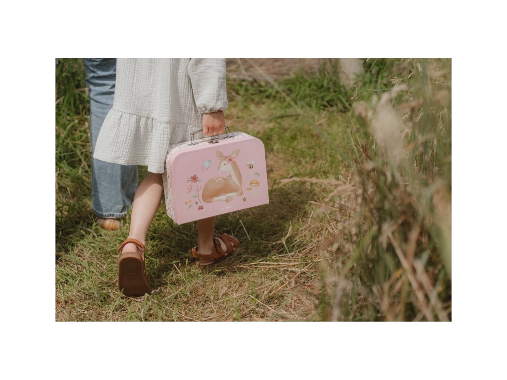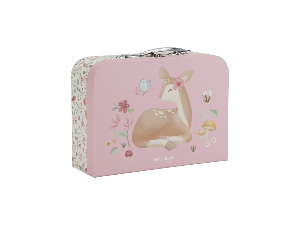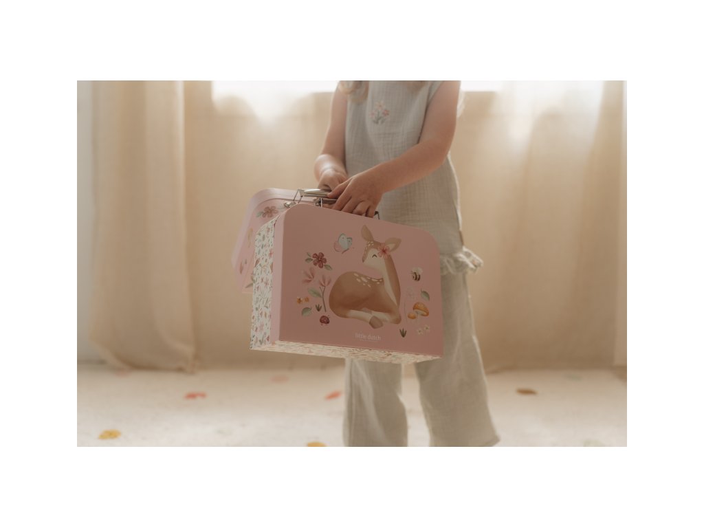 Sada klasických dětských kufříků v kvalitním provedení s krásným potiskem motivů ze života na zahradě. Sadu tvoří dva kufříky, menší kufřík má velikost, která se vejde do většího kufříku pro úsporu místa při skladování. Oba kufříky mají klasické kovové madlo pro snadné přenášení a zámek pro bezpečné uzavření obsahu. Kufříky jsou ideální pro ukládání drobných hraček, výtvarných potřeb apod. a budou sloužit i jako krásná dekorace v dětském pokoji. Sada je součástí designové kolekce hraček a doplňků Little Dutch Fairy Garden inspirované životem na zahradě. Rozměry většího kufříku: 25 x 20 x 8,9 cm Vhodné pro děti od 2 let.
