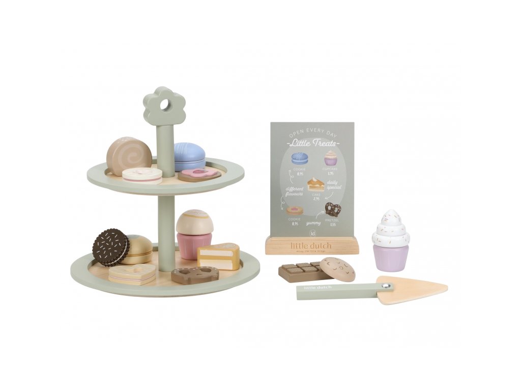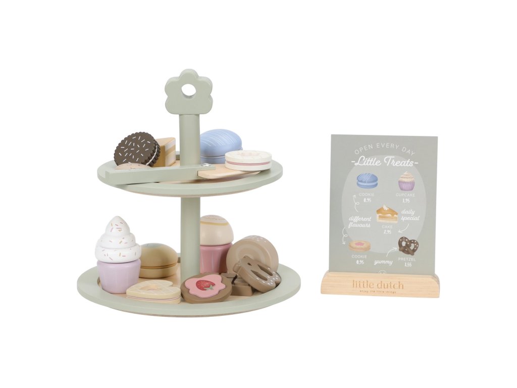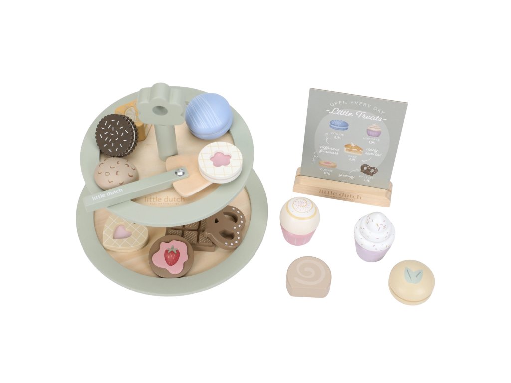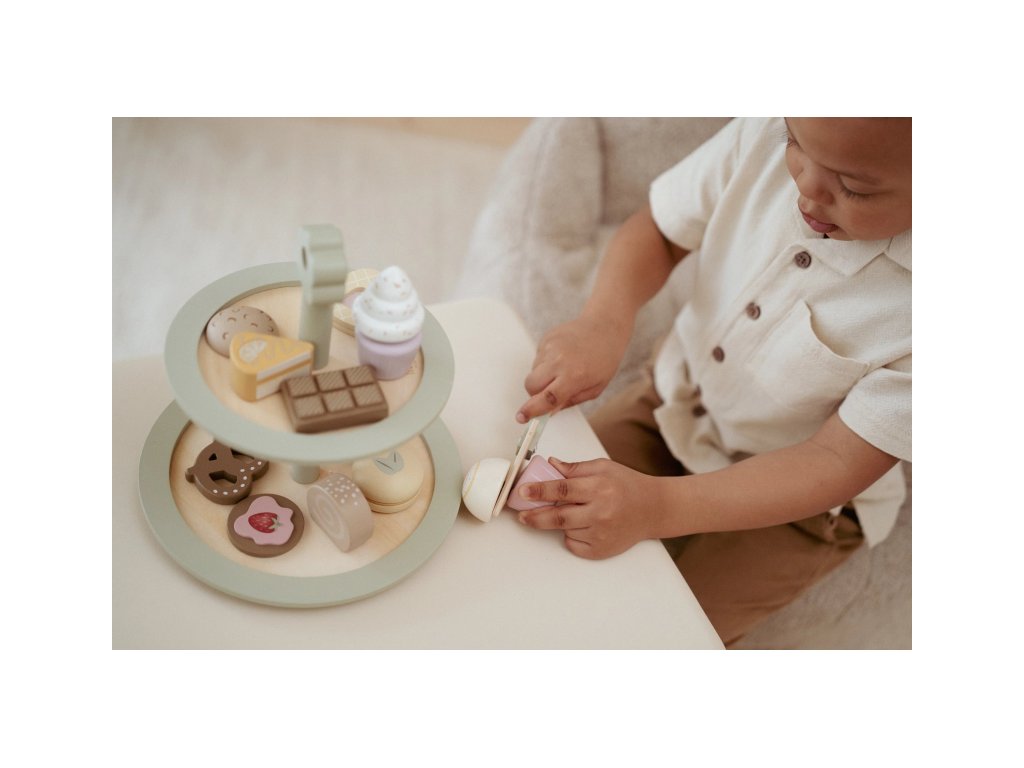 Máte chuť na sladký dezert? Nádherný stojan na cukroví Little Dutch s výběrem sladkých dobrot je jako stvořený pro všechny malé hostitele a hostitelky. Na dvou patrech mohou aranžovat a nabízet svým hostům různé druhy lákavých zákusků. Díky obrázkovému menu si hosté mohou vybírat a objednávat svou oblíbenou sladkost. Elegantní stojan v kvalitním dřevěném provedení je skvělým doplňkem pro hru na čajové dýchánky, narozeninové oslavy nebo vlastní dětskou cukrárnu. Podporuje rozvoj fantazie, jemné motoriky i sociálních dovedností – ať už děti obsluhují své plyšové kamarády, rodinu nebo pořádají hostinu pro princeznu z pohádkové země. Obsah balení: dvoupatrový stojan, servírovací lopatka, různé zákusky a obrázkové menu se stojánkem. Hračka je součástí kolekce vysoce kvalitních dřevěných hraček Little Dutch, navržených s důrazem na bezpečnost a originální design. Vyrobeno z odolného FSC certifikovaného dřeva. Rozměry: 22 × 23,6 × 22 cm Vhodné pro děti od 2 let.
