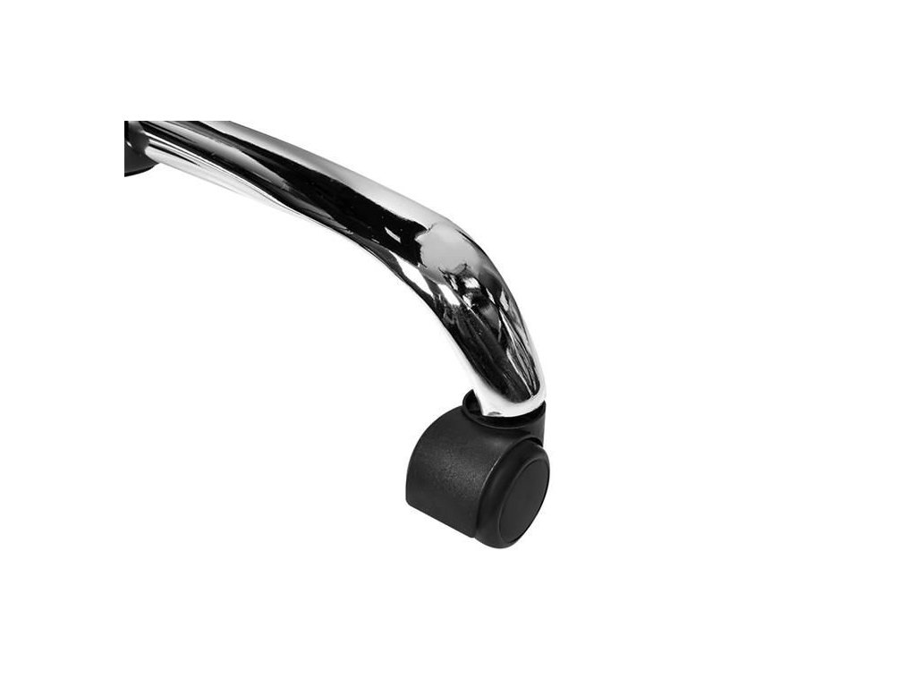 Křeslo je vybaveno pevnými plastovými kolečky, která zajišťují stabilní pohyb. Pětihvězdičkový podstavec z chromované oceli s dvojitými kolečky přidává na eleganci a zajišťuje bezpečnost při používání.