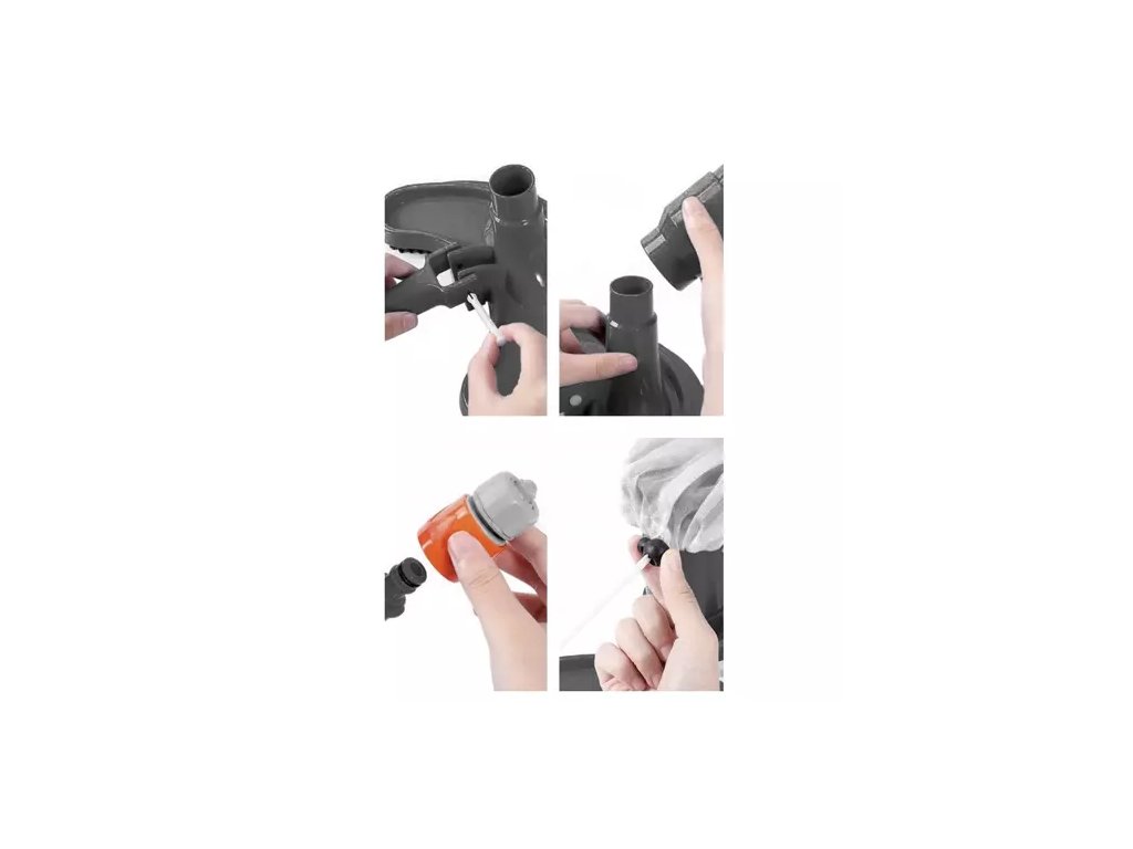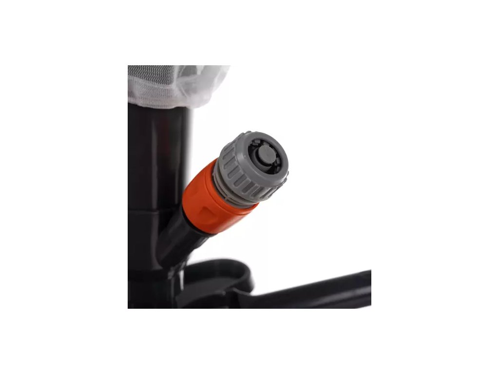 Stačí připojit hadici na vodu k rychlospojce a pustit vodu. Díky tlaku zařízení nasává vodu spolu s nečistotami, které zůstanou zachyceny v sáčku, zatímco voda odteče.