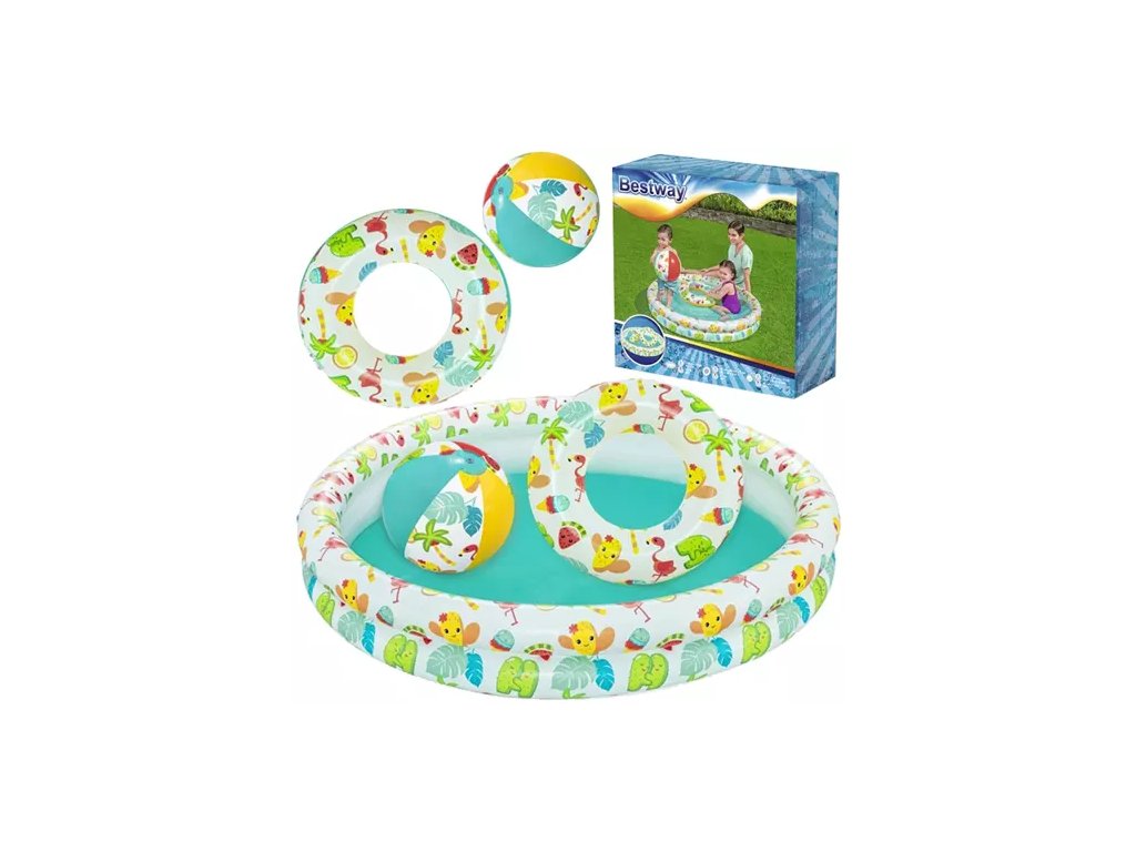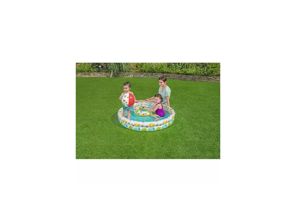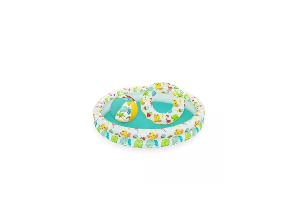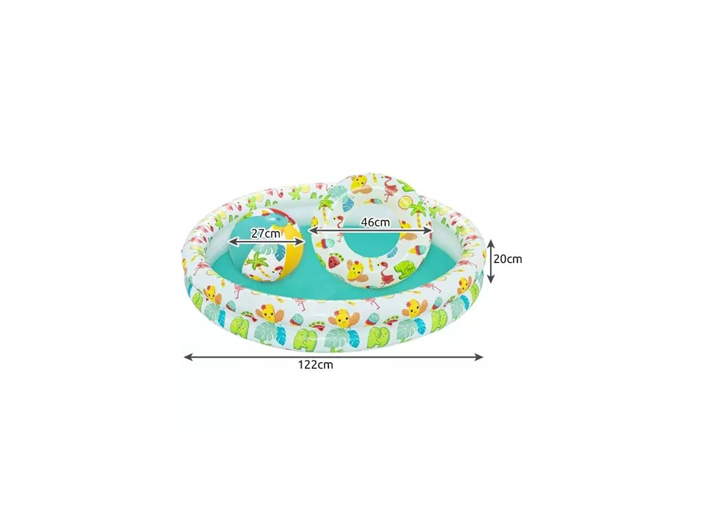 SADA 3v1 - Tento nafukovací set obsahuje brouzdaliště o rozměrech 122 cm x 20 cm. Součástí sady jsou také dvě nafukovací hračky:- Nafukovací míč o průměru 27 cm, který je vhodný pro použití jak ve vodě, tak na zemi.