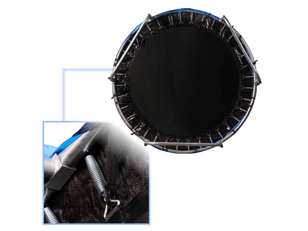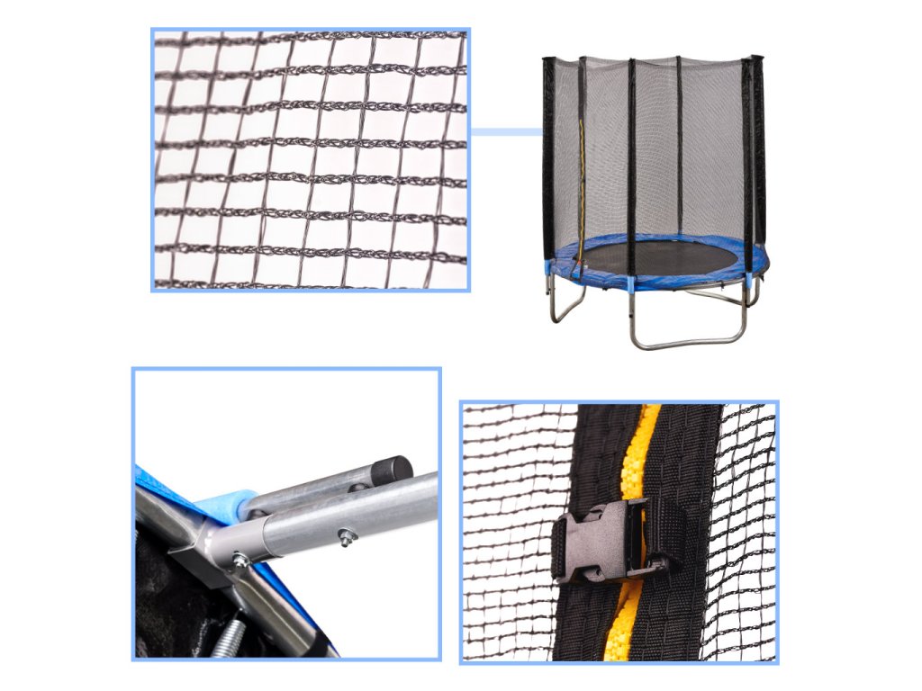 - Trampolína je vybavena základními prvky, jako je bezpečnostní síť a ochranný kryt pružin, které zajišťují bezpečnost při každém skoku.